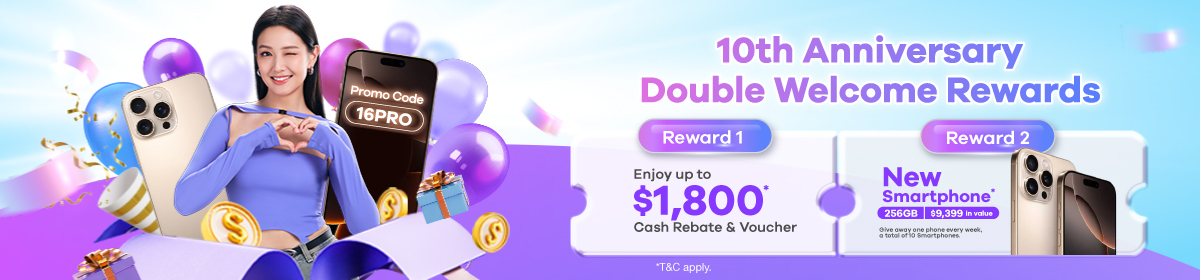 Welcome Rewards 1^ & Rewards 2* cashback & X Pay e-Cash Voucher of up to $1,800 and eligible to participate 【10th Anniversary of Zero Finance】Double Welcome Rewards – Smartphones & Cashback Rewards uo to $1,800.