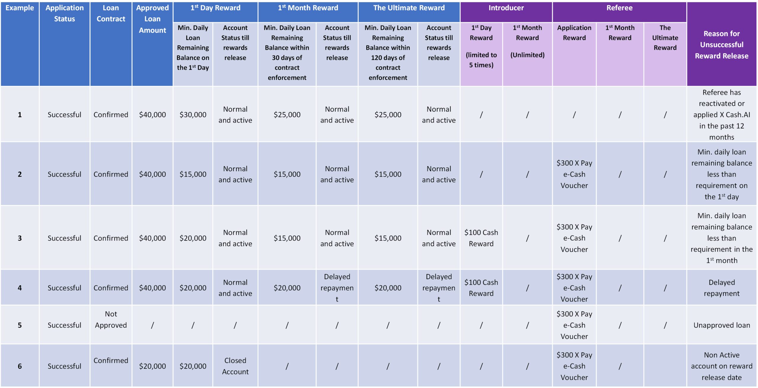 New customers (Referee)^ who confirm loan contract of $20,000 or above, and maintain a minimum daily loan outstanding balance of $20,000 or above under X Cash. AI loan account for 30 days, starting from the loan contract enforcement date, Introducer is eligible to earn $300 Cash Reward and $500 X Pay  e-Cash Voucher2, while Referee is eligible to earn $300 Cash Reward2 correspondingly.
