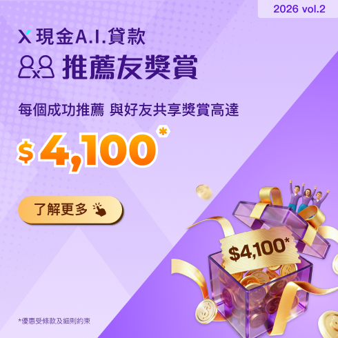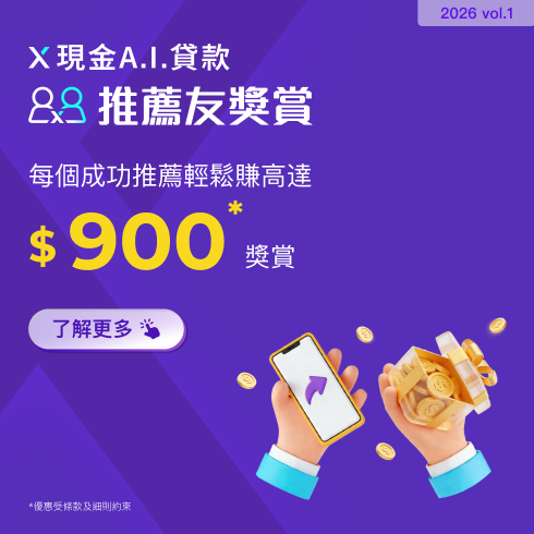 【X現金A.I.貸款推薦友獎賞】推薦親友首次申請並成功獲取貸款,每個推薦賞高達$900獎賞!多推多賞!