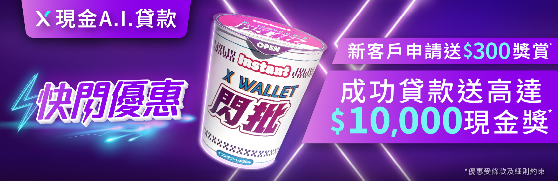 1. 全新客戶^首次申請X現金A.I.貸款,在申請過程中輸入指定優惠碼,不論成功批核與否,送 $300 X Pay電子現金券。