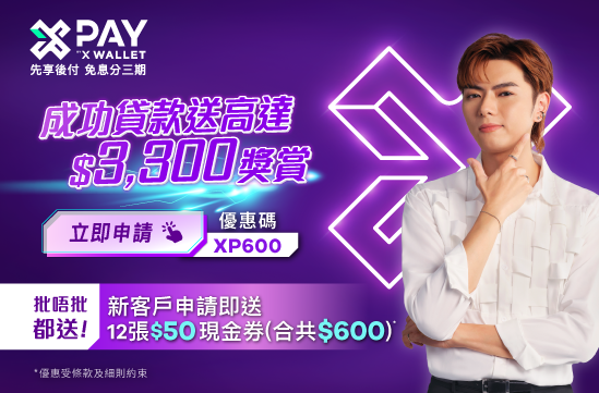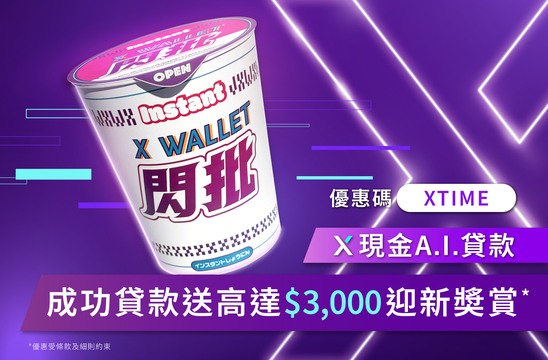 全新客戶首次申請X現金A.I.貸款,在申請過程中輸入優惠碼「XTIME」,不論成功批核與否,送 $300 X Pay電子現金券。成功確認貸款合約^,再送$2,700 現金回贈^!