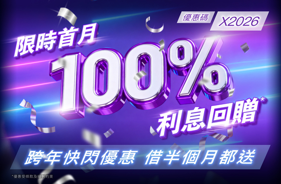在推廣期間,全新客戶^首次申請 X 現金 A.I. 貸款,並在申請過程中輸入優惠碼「X2026」,確認貸款可享受首 30 日 100% 利息優惠。