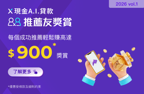 睇準時機除左可以錢搵錢,仲可以賺取豐富獎賞!只要於推廣期內推薦親友首次申請並成功獲取X現金A.I.貸款,你便可就每個推薦享高達$900獎賞!而受薦人亦可獲高達$3,000獎賞。多推多賞!立即打開X Wallet App 分享你嘅「個人推薦碼」俾朋友啦!