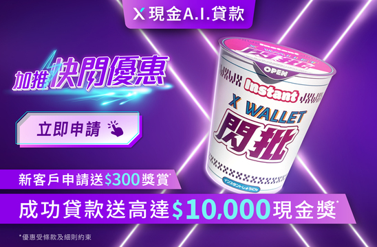 全新客戶^首次申請X現金A.I.貸款,在申請過程中輸入優惠碼「XW10000」,不論成功批核與否,送 $300 X Pay電子現金券。