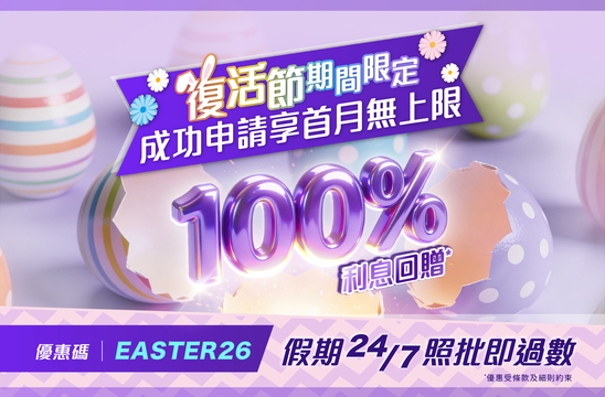 推廣詳情,在推廣期內,全新客戶^於優惠期間首次申請 X現金A.I.貸款,在申請過程中輸入優惠碼「EASTER26」並確認任何金額之貸款,即可享首月結單100% 利息回贈,回贈金額不設上限。