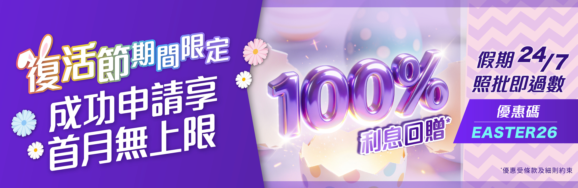 1. 在推廣期內,全新客戶^於優惠期間首次申請 X現金A.I.貸款,在申請過程中輸入優惠碼「EASTER26」並確認任何金額之貸款,即可享首月結單100% 利息回贈,回贈金額不設上限。