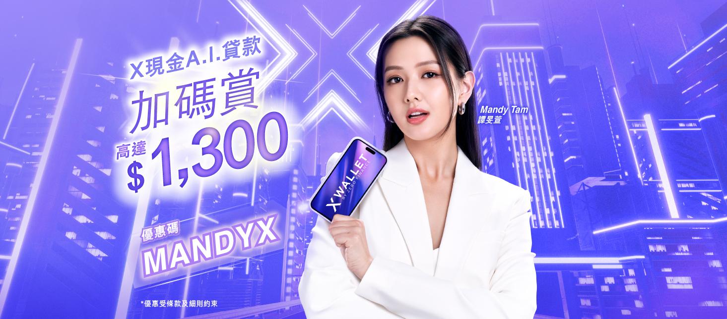 (1) 全新客戶首次申請X現金A.I.貸款,在申請過程中輸入優惠碼「MANDYX」,不論成功批核與否,送 $100 X Pay電子現金券。