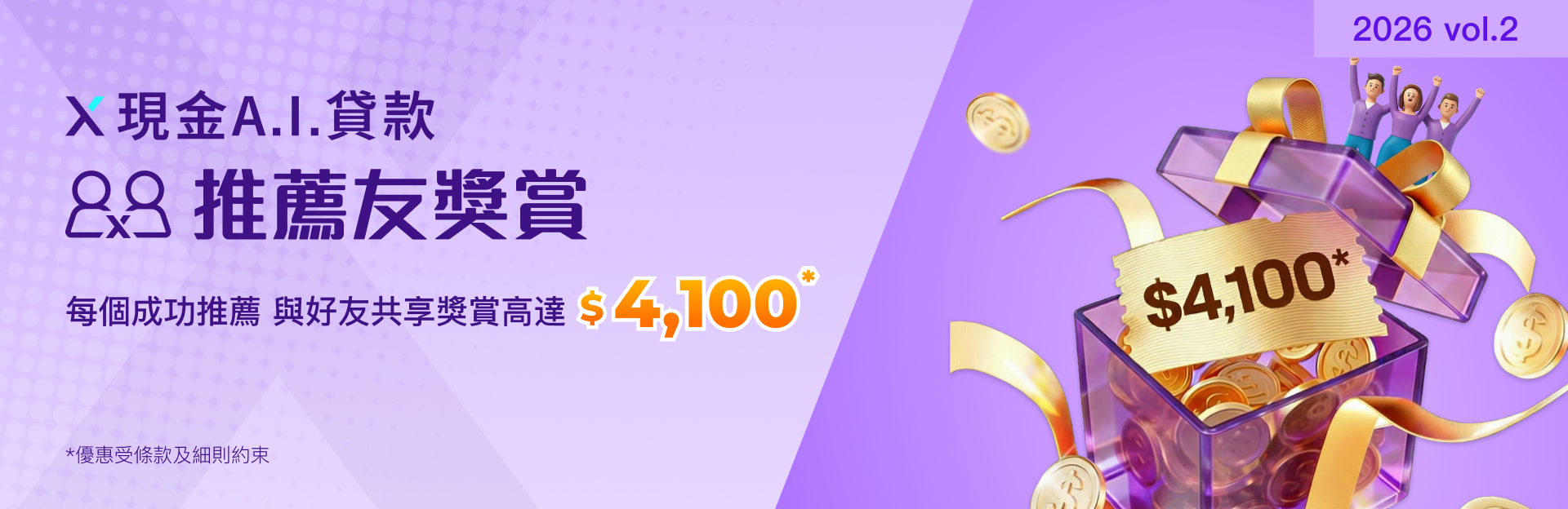 【X現金A.I.貸款推薦友獎賞】推薦親友首次申請並成功獲取貸款,每個推薦與好友共享獎賞高達$4,100!多推多賞!