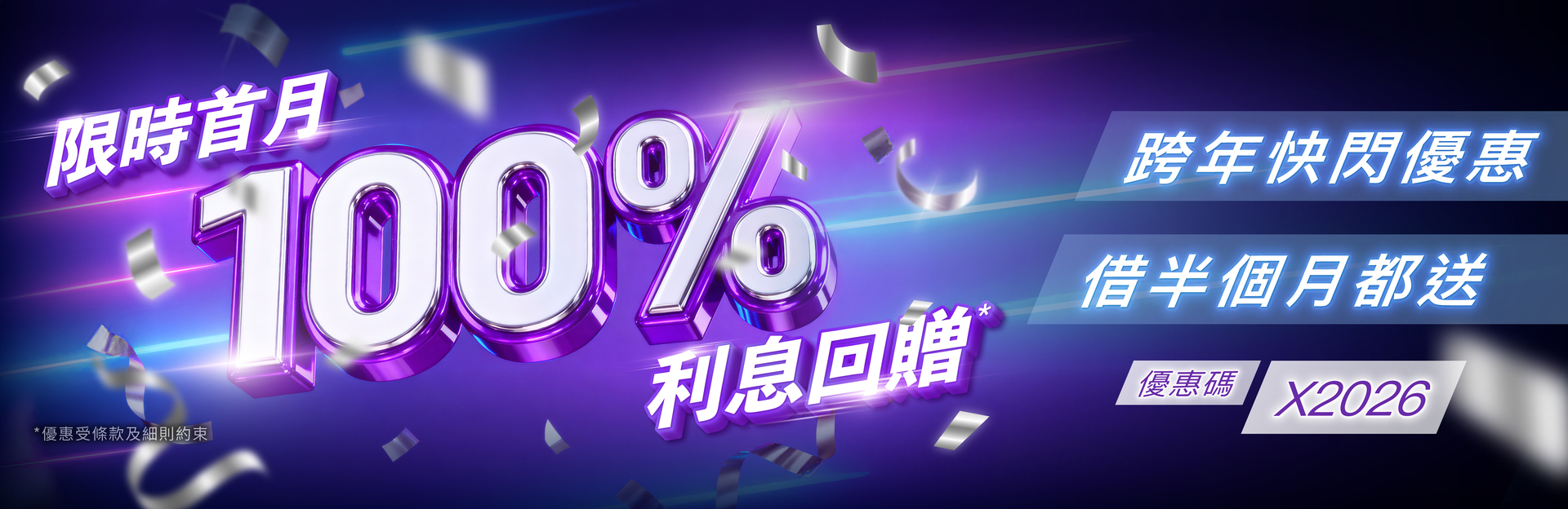 - 在推廣期間,全新客戶^首次申請 X 現金 A.I. 貸款,並在申請過程中輸入優惠碼「X2026」,確認貸款可享受首 30 日 100% 利息優惠。
