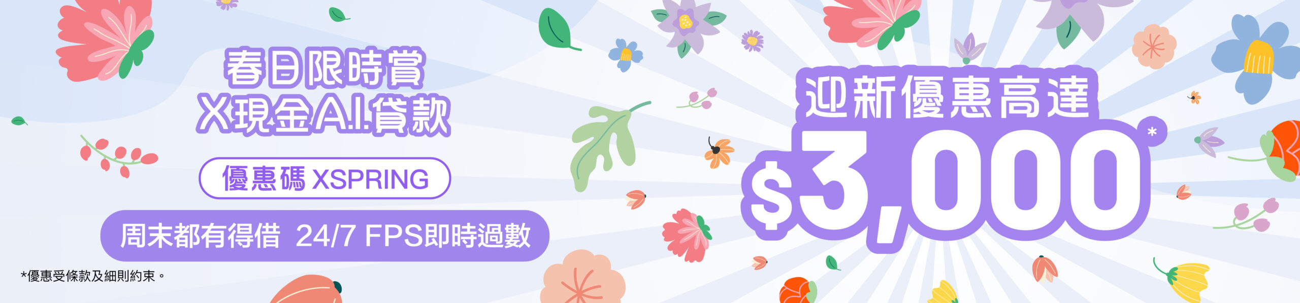 X節日限時賞,送你春日小驚喜!於推廣期內,全新客戶^申請X現金A.I.貸款可享高達$3,000獎賞。24/7即時過數,任何時間都隨時為你服務,滿足你的理財需要!
